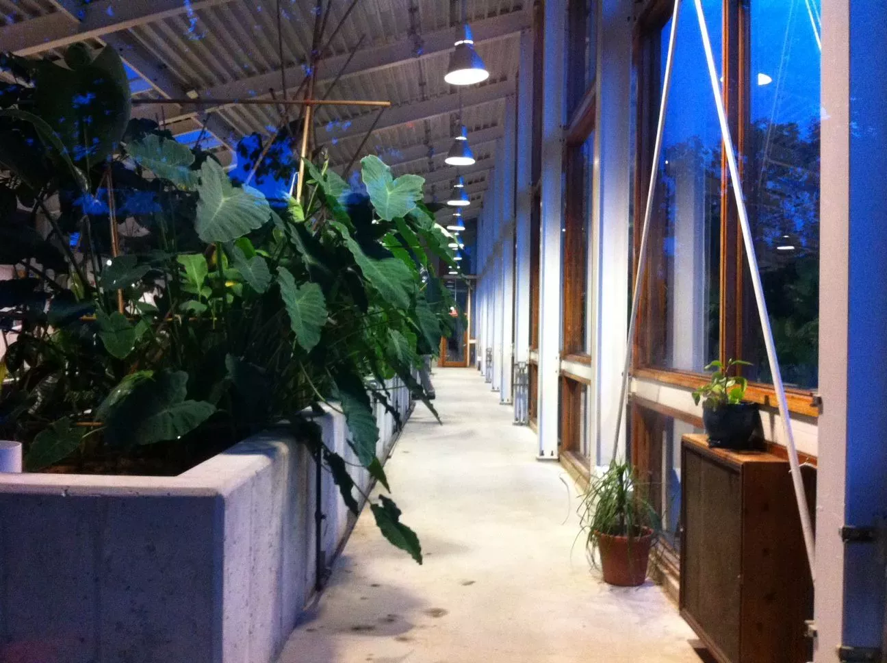 听起来逼格很高?其实污水处理真没有什么奥秘,其处理原理就很简单。一开始,所有污物像人类排泄物和“灰水”例如厕所、洗手盆和淋浴等产生的废水送入储罐收集,然后输送至生态机器。第二阶段是用两个18立方米的化粪池和缺氧池作为调节预处理,出入流水四个造湿地,内衬橡胶,堆满碎石,利用依附在植物根系上的生物膜对污水作进一步净化。据说此时污染物去除已达75%。第三阶段是好氧曝气池,一个多级食物链的生态系统,去除大部分的营养物。最后经循环砂滤后,废水就已经变成符合标准的家庭用的清洁水源。这个生态机器是一个现代温室构造,太阳光伏板供电,里边还能用作瑜伽课室。