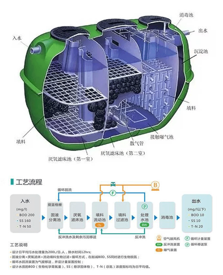 1 净化槽埋设于地表以下,设备上面的地表可作为绿化或其他用地,不需要建房及采暖、保温,适用于农村污水。