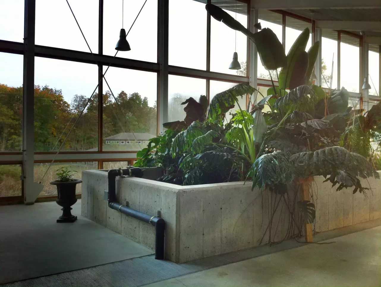 听起来逼格很高?其实污水处理真没有什么奥秘,其处理原理就很简单。一开始,所有污物像人类排泄物和“灰水”例如厕所、洗手盆和淋浴等产生的废水送入储罐收集,然后输送至生态机器。第二阶段是用两个18立方米的化粪池和缺氧池作为调节预处理,出入流水四个造湿地,内衬橡胶,堆满碎石,利用依附在植物根系上的生物膜对污水作进一步净化。据说此时污染物去除已达75%。第三阶段是好氧曝气池,一个多级食物链的生态系统,去除大部分的营养物。最后经循环砂滤后,废水就已经变成符合标准的家庭用的清洁水源。这个生态机器是一个现代温室构造,太阳光伏板供电,里边还能用作瑜伽课室。